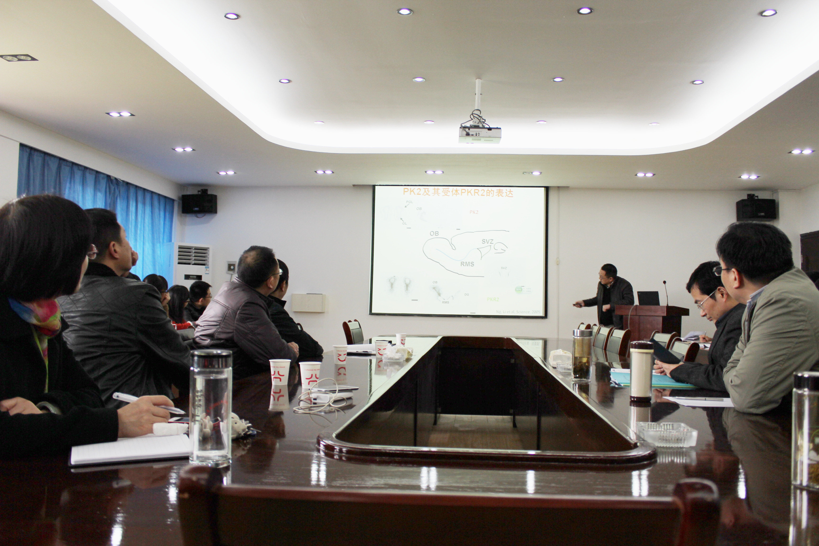 2015年4月9日 ,下午三点,来自中南大学的李家大教授莅临我校做了主题为“G蛋白偶联受体PKR1/2功能研究”的学术报告,beat365亚洲版官网院长黄胜堂、党支部书记闵清等领导和老师以及相关专业研究生参加了此次讲座。