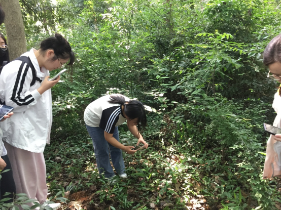 学生学习辨认淡竹叶、栀子、络石藤、阔叶山麦冬(东区食堂前小树林)