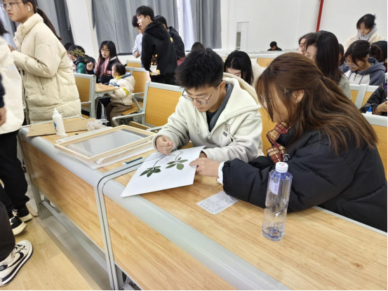 在实践环节中,同学们认真选取叶片、花朵、果实等药用植物材料,前期运用压制、干燥等专业技术处理,然后对中草药进行造型摆放,还原自然生长,再用针线、胶水固定。最后,制作药用植物“身份证”,注明品名、采集时间、地点等信息,一件兼备科学性与艺术性的标本作品就完成了。活动中,老师们特别结合中药学中的“道地药材”概念,详细介绍了不同产地药材在外观、成分及药效上的差异,并引导学生认识到保护优质中草药资源对中医药产业发展的重要性。