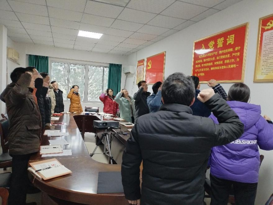 学习研讨前,金小红同志清查到会人员及党费核算后,全体起立,高声齐唱国歌;周学文同志领誓,全体党员重温入党誓词;王小波同志诵读《党章》第九章《党组》。