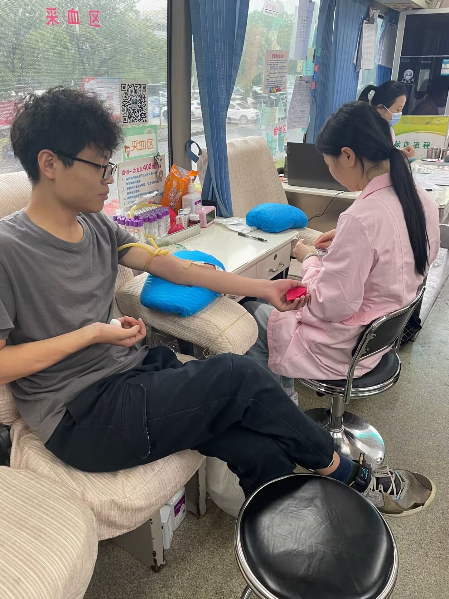 活动当天,虽艳阳高照,但前来献血的师生络绎不绝。在志愿者们的组织下,师生们按顺序进行了领表登记、血型测定、抽血和观察休息。在工作人员的讲解和鼓励下,不少同学们也克服恐惧,力所能及献出鲜血,处理创口之后,由志愿者带到休息区,每人赠送一份糖水和点心以及证书,同时询问并观察献血者身体恢复情况,整场活动有条不紊地进行着。遗憾的是,有不少同学因个人身体等原因这次不能献血,纷纷表示下次一定积极参加献血及其他志愿服务活动。